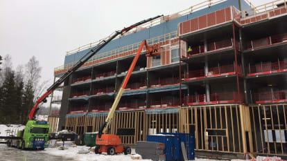 I overkant av 70 veggelementer a 1,2 tonn skal monteres og kles i det vedlikeholdsfrie behandlede treverket MøreRoyal. Hvert veggelement tar om lag en time å montere.