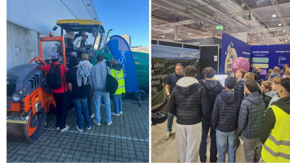 NCC presenterer betong- og asfaltfaget under Bygg Camp 2025, og dyktige NCC-ansatte fra asfalt har demonstrert utstyr – til stor begeistring for elevene, som blant annet fikk sitte på asfaltutleggeren!